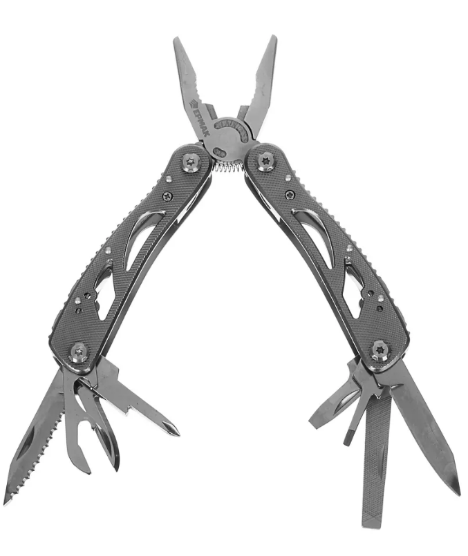 Многофункциональный инструмент ЕРМАК 11 функций, 9 насадок на отвертку+адаптер, 16.5см 118-168 – необходимая вещь в доме, в походе или в машине.Инструмент придет на помощь, когда необходимо устранить поломку или неисправность. Он совмещает в себе сразу 11 функций – это длинные щипцы, пассатижи, кусачки, нож, две плоские отвертки и одна крестообразная + 9 насадок, линейка/пилочка, консервный нож, зазубренное лезвие ножа, скребок.