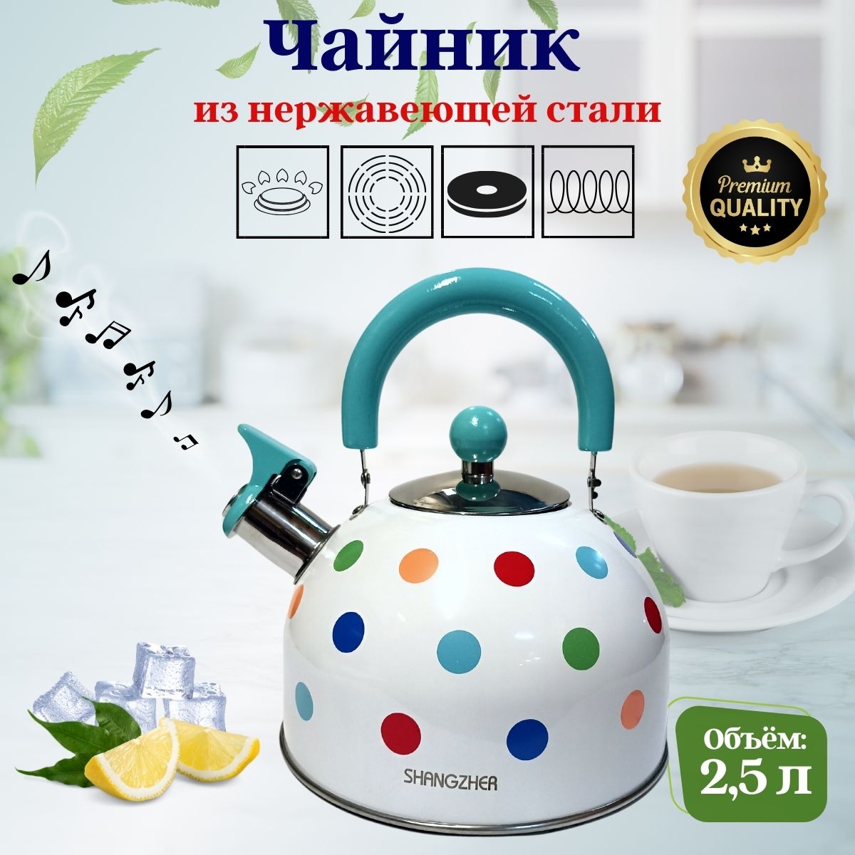 Чайник 2,5л нержавеющая сталь HR736-10 белый в горох OLS-16-4/OLS-016-12