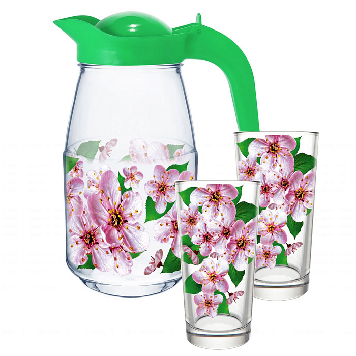 Набор для воды - универсальная посуда, подходящая для употребления практически любых прохладительных напитков. Такие модели особенно практичные и удобные в использовании. Качественное стекло и эргономичная форма обеспечивает долгий срок службы, а интересные дизайнерские воплощения делают набор изысканным. Яркий и сочный декор, украсит ваш интерьер. Набор для воды 3 предметов: Кувшин 1,5л+2 стакана по 0,23 л.