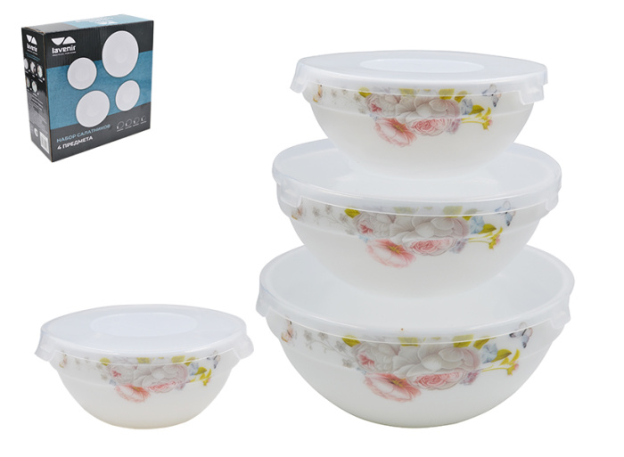 Набор салатников с крышками - идеальное решение для хранения и сервировки разнообразных салатов и закусок. В набор входят четыре салатника разного размера:V - 600 мл, D - 17,8 см, h - 8 см