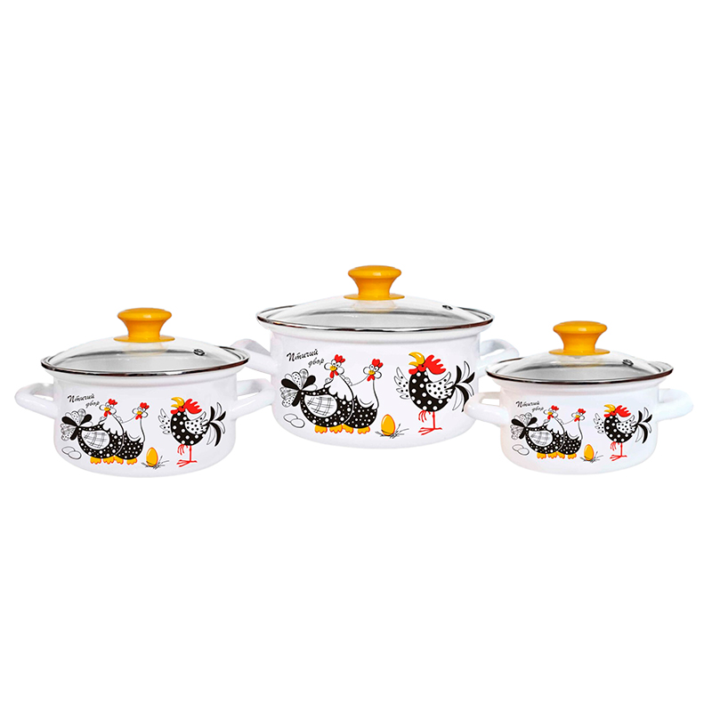 Набор кастрюль эмалированных из стали. Кастрюли цилиндрической формыВ кухонном наборе: кастрюли объёмом 1,0л, 1,5л и 2,3л с ярким рисунком.Нержавеющий ободок, стекляная крышка с отверстием для пароотведения. Эмалированная посуда изготовлена из высококачественного стального проката и покрыта двумя слоями жаропрочной эмали. Эмалевое покрытие кастрюлей надежно защищает пищу от контакта с металлом, оно инертно и устойчиво к пищевым кислотам, не вступает во взаимодействие с продуктами и не искажает их вкусовые качества. Стальная эмалированная посуда предназначена для приготовления пищи, хранения пищевых продуктов и других хозяйственных нужд. Она гигиенична и удобна в эксплуатации. Эмалированная поверхность исключает контакт пищи с металлом, не наносит вреда здоровью, гигиенична и проста в уходе.