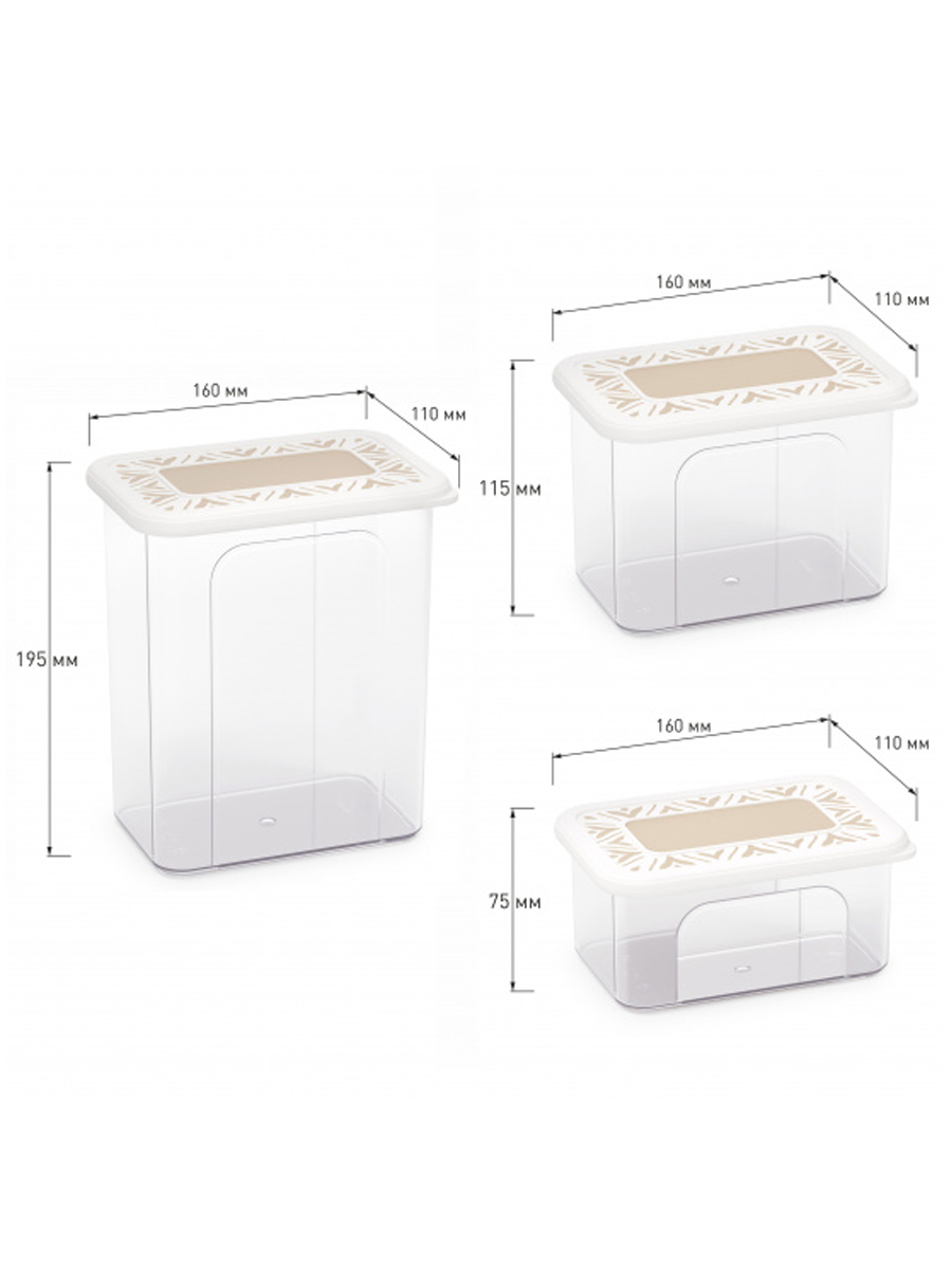 Банки для сыпучих продуктов можно хранить в холодильнике и морозильной камере, использовать в СВЧ и посудомоечной машине. Крышка из ТЭП плотно прилегает к корпусу и защищает содержимое от проникновения влаги. В наборе прямоугольные банки объемом 800мл, 1.4л и 2.2л. Контейнеры для хранения помогут вам упорядочить пространство и создать особую атмосферу.