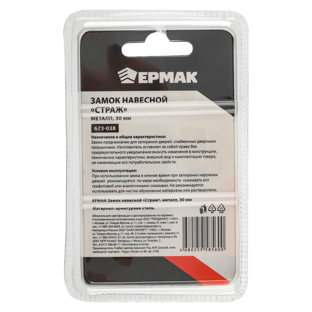 Замок навесной ЕРМАК "Страж" 30 мм надежно защитит любое помещение от взлома и кражи имущества. Чугунный корпус плохо поддается распилу и характеризуется высокой прочностью. Закаленная дужка не подвержена деформации и устойчива к механическим воздействиям. Замок имеет продуманную конструкцию с нижним размещением замочной скважины: дождевая вода не будет затекать внутрь. В комплекте 3 ключа.