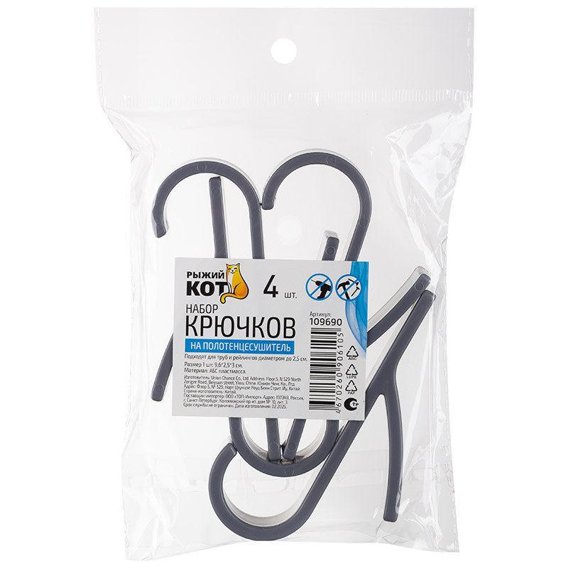 Набор крючков на полотенцесушитель (4 шт), 9,6*2,5*3 см, серый 109690