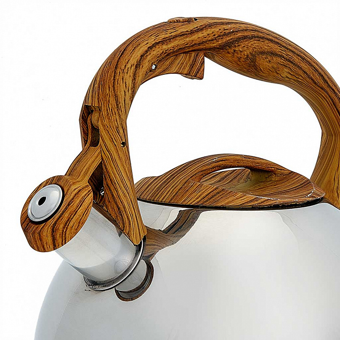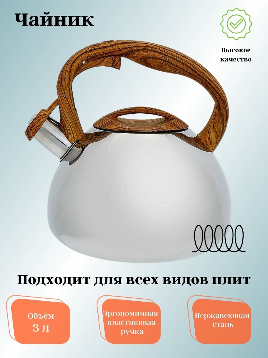 Категория Чайники для кипячения воды. Цвет серебристый. Объем 3 л. Материал нержавеющая сталь. Со свистком да. Тип варочной поверхности стеклокерамическая, индукционная, газовая, электрическая. Полированный да. Тип полировки зеркальная. Термоизолированная ручка да. Вид ручки фиксированная. Дополнительная информация толщина стали: 0,6 мм; ручка с противоскользящим покрытием и с кнопкой для открывания носика.