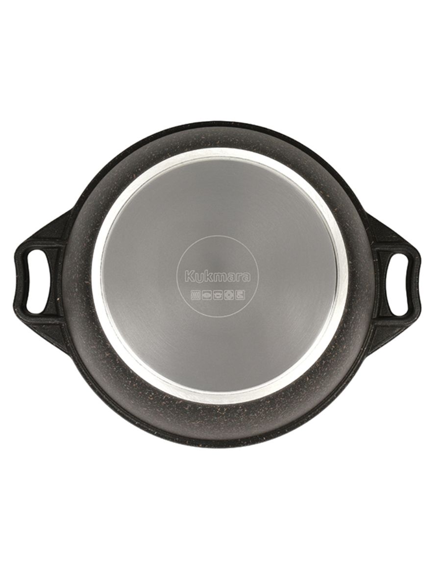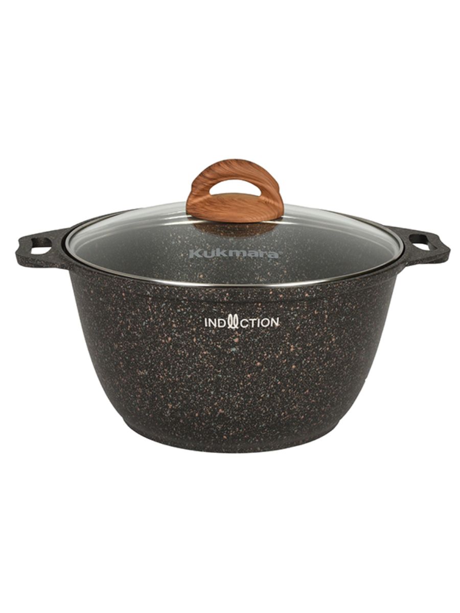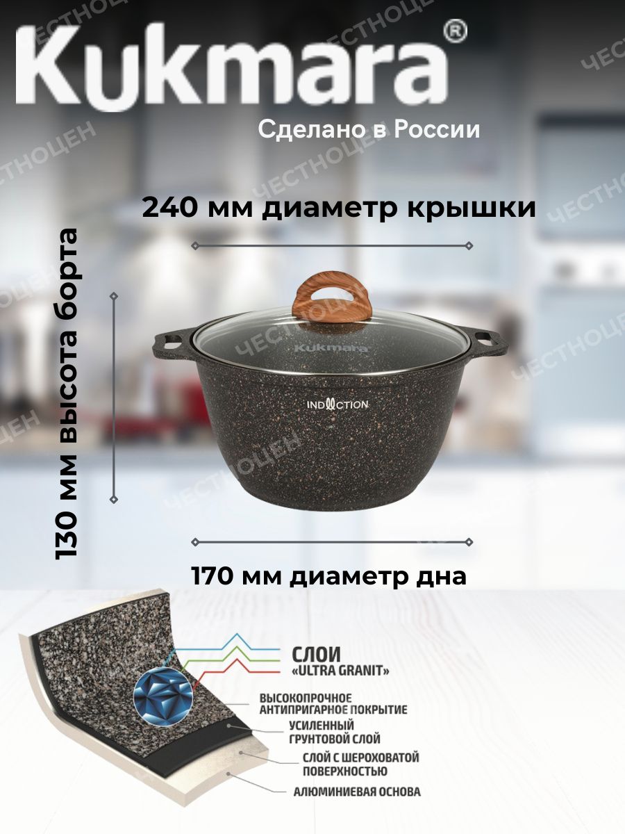 Ультрапрочное многослойное антипригарное покрытие ultra granit позволяет использовать даже неострые металлические предметы. Такое покрытие, усиленное сверхтвердыми минералами близкими по твердости к алмазу, гарантирует долгий срок службы даже при ежедневном использовании, при этом абсолютно безопасно для здоровья, без PFOA. Покрытие не требует особенного ухода, легко моется вручную. Цветовые решения коллекции Granit ultra подойдут к любому интерьеру кухни. Кастрюля Kukmara с гранитным покрытием имеет ровное проточенное дно, которое обеспечивает максимальное прилегание дна посуды к плите для более быстрого и равномерного нагрева. Преимущества кастрюли Kukmara Granit Ultra: 15000 циклов истирания, 6ти слойная система; значительная толщина стенок и дна исключает деформацию корпуса кастрюли возможность использования минимального количества масла; усиленная антипригарная система; продукты не пригорают и сохраняют свой вкус; легкость мытья; подходит для всех типов плит