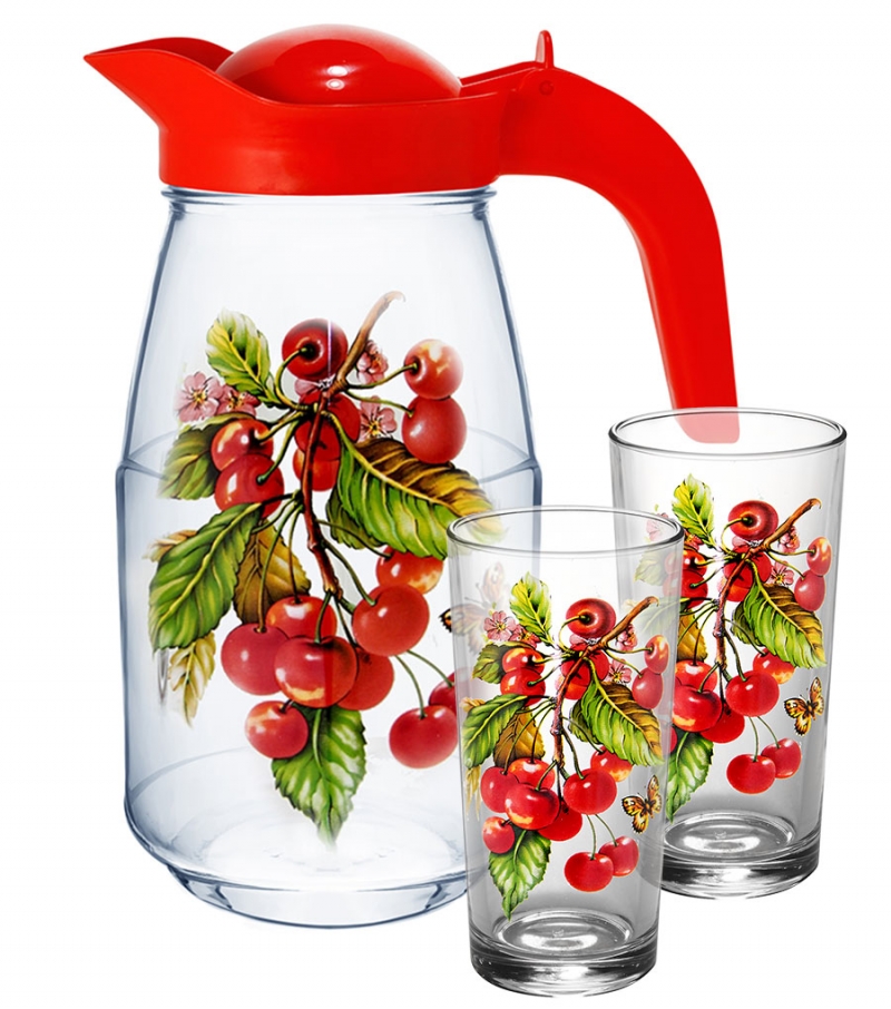 Набор для воды с яркой деколью универсальная посуда, подходящая для употребления практически любых прохладительных напитков. Такие модели особенно практичные и удобные в использовании. Качественное стекло и эргономичная форма обеспечивает долгий срок службы, а интересные дизайнерские воплощения делают набор изысканным. Яркий и сочный декор, украсит ваш интерьер. Набор для воды 3 предметов: Кувшин 1,5л+2 стакана по 0,23 л.